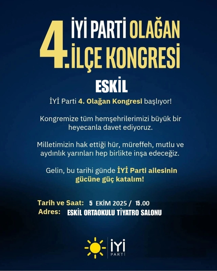 İYİ Parti Eskil İlçe Başkanlığı, 4. Olağan İlçe Kongresi için hazırlıklarını tamamladı. İlçe Başkanı Dağıstan Filikçi’nin ev sahipliğinde düzenlenecek kongre, 5 Ekim 2025 Pazar günü saat 15.00’te Eskil Ortaokulu Tiyatro Salonu’nda gerçekleştirilecek.