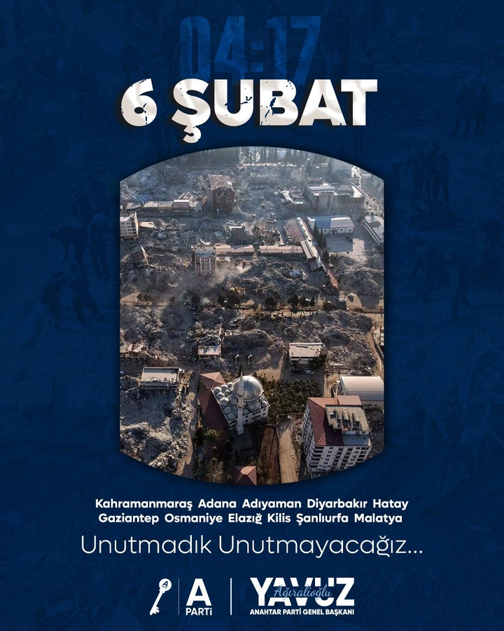 Anahtar Parti Genel Başkanı Yavuz Ağıralioğlu, sosyal medya hesabından yaptığı paylaşımla deprem felaketlerinde yaşanan acıların unutulmaması gerektiğine dikkat çekti. Ağıralioğlu, her unutulan depremin yeni felaketlere davetiye çıkardığını vurgulayarak toplumsal hafıza ve sorumluluk çağrısında bulundu.