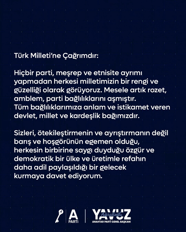 Ağıralioğlu’nun metni, hem siyasi aktörlere hem de toplumun tüm kesimlerine yönelik bir birlik çağrısı niteliği taşıyor. Türkiye’nin ortak değerlerinde birleşmenin milli güç açısından zorunlu hale geldiğini vurgulayan lider, “daha güçlü Türkiye” hedefinin yolunun toplumsal dayanışmadan geçtiğini ifade etti.