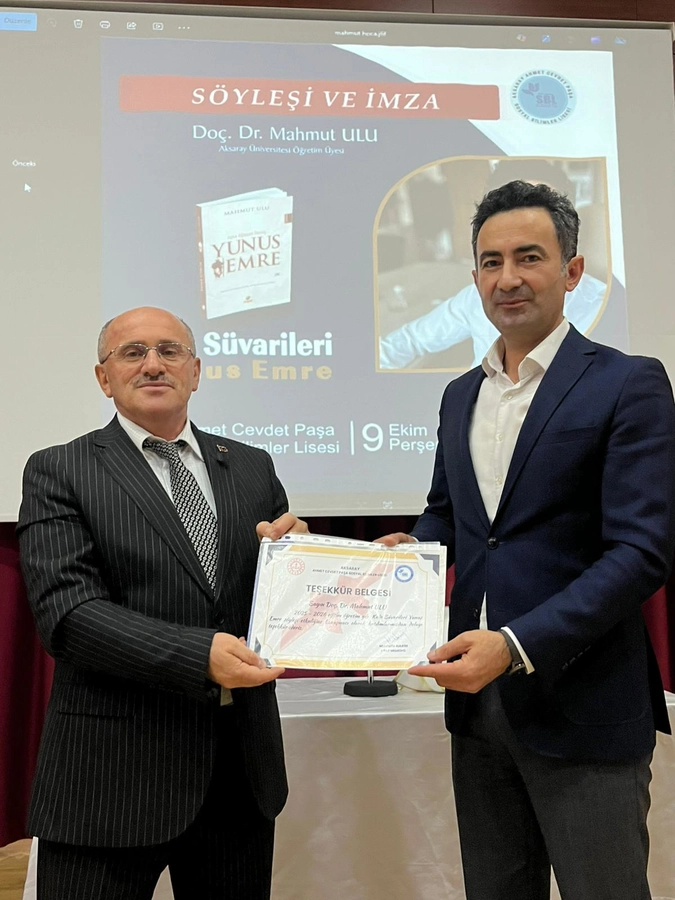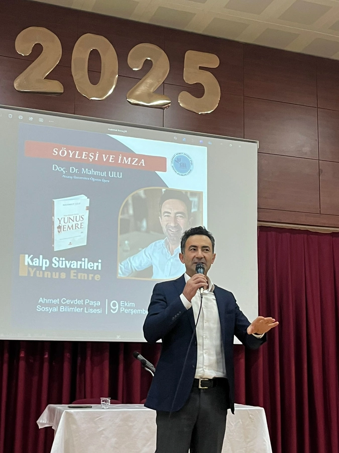 “Ahmet Cevdet Paşa Sosyal Bilimler Lisesi olarak; gururla ifade ettiğimiz liseden öğrencimiz Doç. Dr. Mahmut Ulu tarafından okulumuzda ‘Kalp Süvarileri – Yunus Emre’de Peygamber Sevdası’ konulu konferans verildi. Kıymetli hocamıza teşekkür ediyorum.”