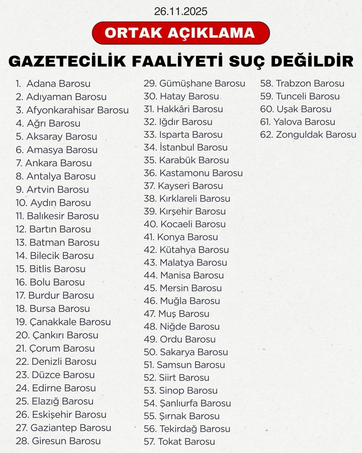 Türkiye’nin dört bir yanından Adana, Ankara, İstanbul, Antalya, Mersin, Bursa, Kocaeli, Gaziantep, Şanlıurfa ve Aksaray’ın da aralarında bulunduğu toplam 62 baro, bildiriyi imzalayarak tutuklamaya karşı ortak duruş sergiledi.