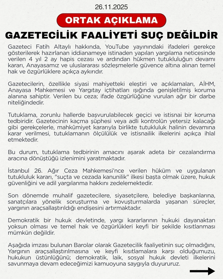 62 baro tarafından hazırlanan metinde, Altaylı’nın YouTube yayınındaki ifadeleri nedeniyle hazırlanan iddianame ve sonucunda verilen 4 yıl 2 ay hapis cezası ile tutukluluğunun devamı kararının, Anayasa ve uluslararası sözleşmelerle güvence altına alınmış temel haklara aykırı olduğu belirtildi.