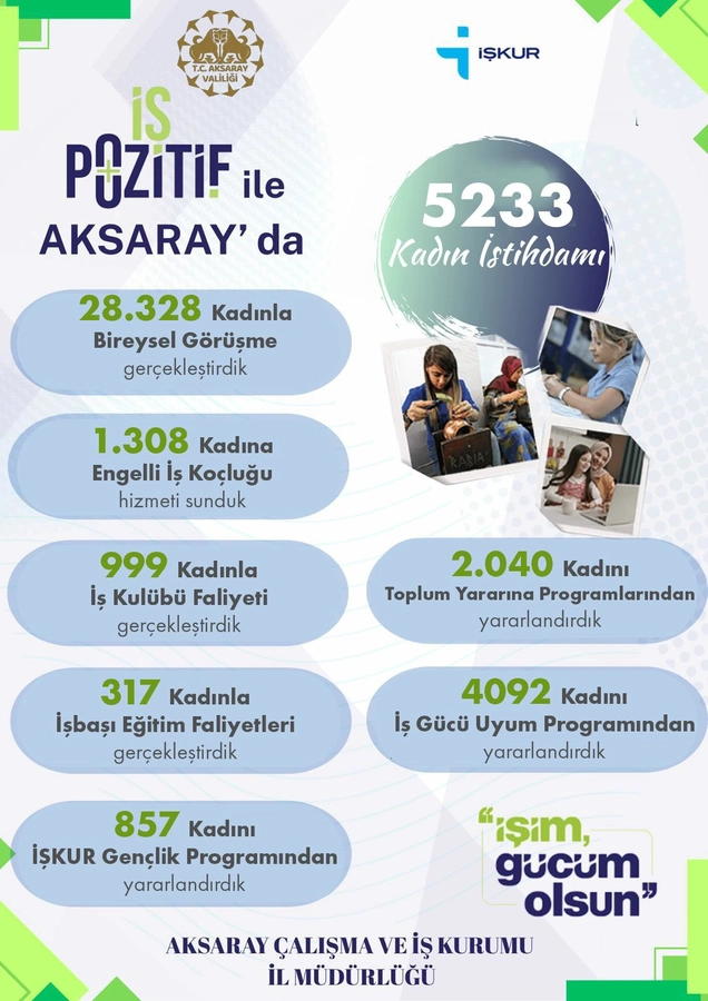 Aksaray Valiliği öncülüğünde, kurum ve kuruluşların iş birliğiyle Aksaray Çalışma ve İş Kurumu (İŞKUR) İl Müdürlüğü tarafından yürütülen İş Pozitif Kadın Çalışmaları, 2024–2025 döneminde kadınların işgücüne katılımını artırmaya yönelik somut ve örnek sonuçlar ortaya koydu. Kadınların istihdam olanaklarına erişimini güçlendirmeyi, dezavantajlı grupları üretimle buluşturmayı hedefleyen çalışmalar, Aksaray’da kadın istihdamında dikkat çekici bir artış sağladı.