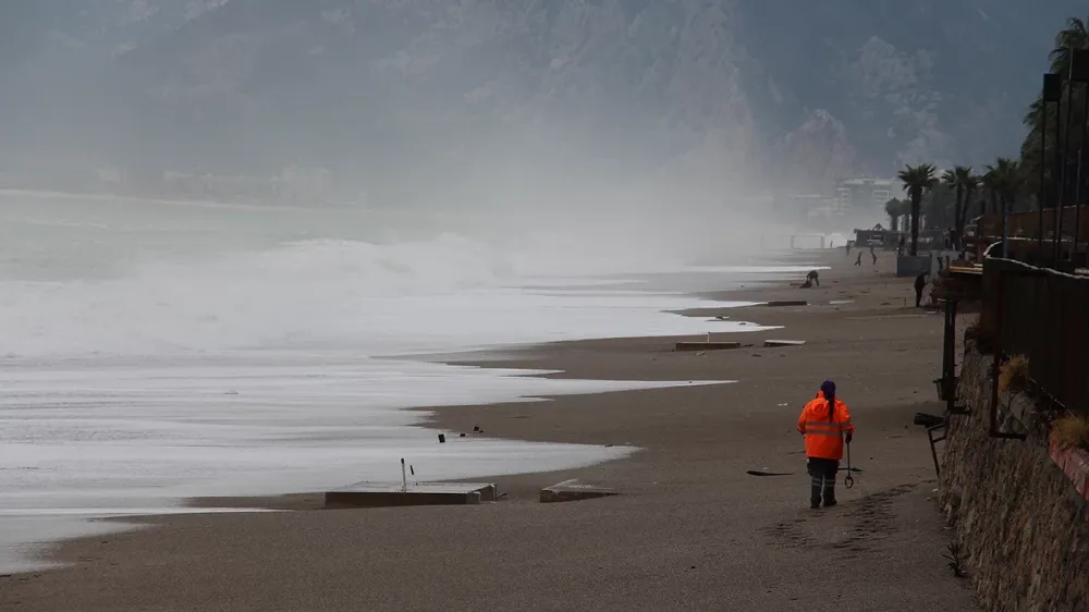 Konyaaltı Sahili'nde dalgalar oluştu. Olumsuz hava koşullarına rağmen bazı turist ve vatandaşlar, sahil bandında yürüyüş yaptı, dalgaları görüntülemeye çalıştı.