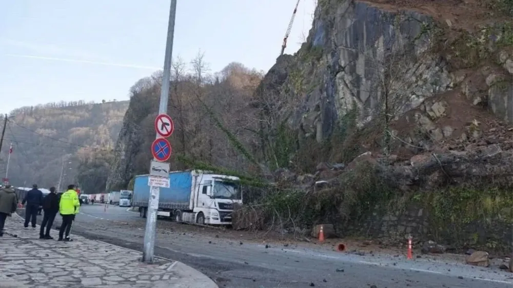 Artvin’in Kemalpaşa ilçesinde bulunan Sarp Sınır Kapısı’nda yamaçtan kopan toprak ve kaya parçaları, çıkış yapmak üzere sıra bekleyen bir tırın üzerine düştü. Heyelan sonucu aracın ön bölümünde maddi hasar meydana geldi.