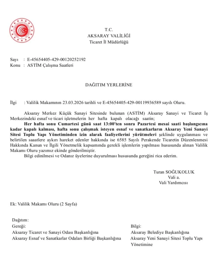 Aksaray Küçük Sanayi Sitesi esnafı için çalışma saatleri yeniden düzenlendi. Aksaray Valiliği kararıyla her Cumartesi saat 13.00’ten Pazartesi mesai başlangıcına kadar iş yerleri kapalı olacak. Hafta sonu çalışmak isteyenler, ilgili yönetimden izin almak zorunda.