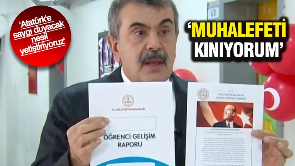 "Bakın biz Milli Eğitim Bakanlığı olarak Atatürk başta olmak üzere bu ülkeyi bize emanet eden herkese, onların emanetine maddi ve manevi emanetlerine saygı duymak, saygı duyacak bir kuşak yetiştirmekte mükellefiz. Dolayısıyla bizim Atatürk ya da Atatürk'ün saygınlığı ile ilgili olumsuz bir tavır içerisinde bulunacağımızı iddia eden muhalefeti ben buradan kınıyorum. Açık yüreklilikle söylüyorum. Bu açık bir niyet okuyuculuktur. Karnemiz ve gelişim raporumuz burada. Şimdi bu yeni bir uygulama. Bu da karnemiz."