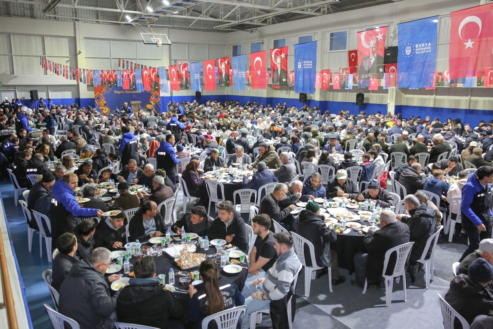 BURSA (İGFA) - Bursa Büyükşehir Belediyesi tarafından Büyükorhan Kapalı Spor Salonu’nda düzenlenen programa, Bursa Büyükşehir Belediyesi Başkanvekili Mehmet Aydın Saldız, Büyükşehir Belediyesi bürokratları, Büyükşehir iştiraklerinin yöneticileri, siyasi parti temsilcileri, meclis üyeleri ve sivil toplum kuruluşlarının temsilcileri katıldı. İftar programı samimi bir ortamda gerçekleşirken, akşam ezanıyla birlikte vatandaşlar oruçlarını açtı.
