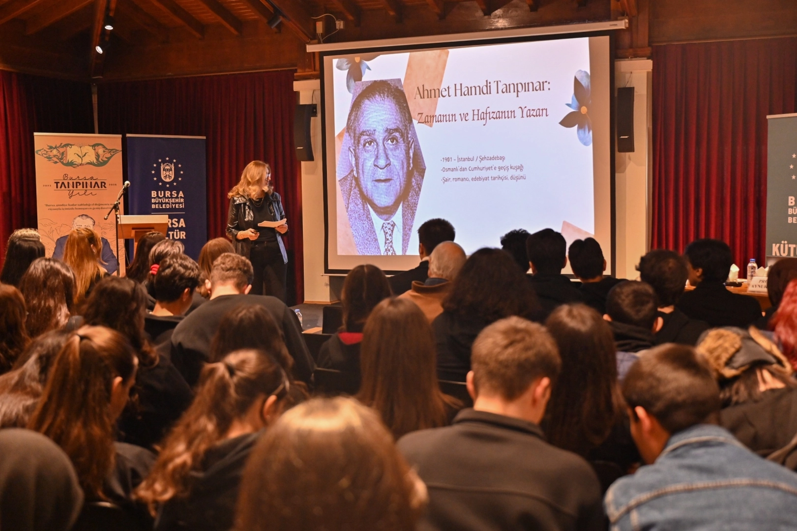 BURSA (İGFA) - Bursa Büyükşehir Belediyesi Kültür ve Sosyal İşler Dairesi Başkanlığı Kütüphaneler Şube Müdürlüğü tarafından Şehir Kütüphanesi’nde ‘Tanpınar’ın İzinde: Mitlerin Modern Yankısı’ söyleşisi gerçekleştirildi.