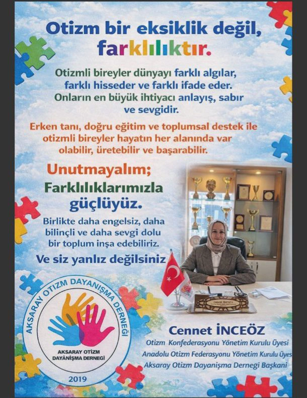 Aksaray Otizm Dayanışma Derneği Başkanı ve Anadolu Otizm Federasyonu Yönetim Kurulu Üyesi Cennet İnceöz, yaptığı açıklamada otizmin dünyada en hızlı yayılan engel gruplarından biri olduğunu belirterek toplumun bilinçli ve duyarlı davranmasının hayati önem taşıdığını vurguladı. İnceöz, otizmi tamamen ortadan kaldıran bir tedavinin henüz bulunmadığını, bilinen en etkili yöntemin eğitim olduğunu söyledi.