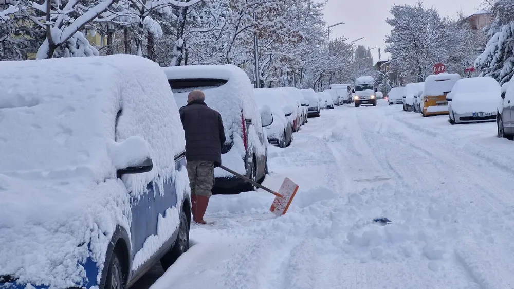 Park halindeki araçların karla kaplandığı kentte, belediye ekipleri temizlik çalışması başlattı. Kar yağışı kırsalda da etkili oldu.