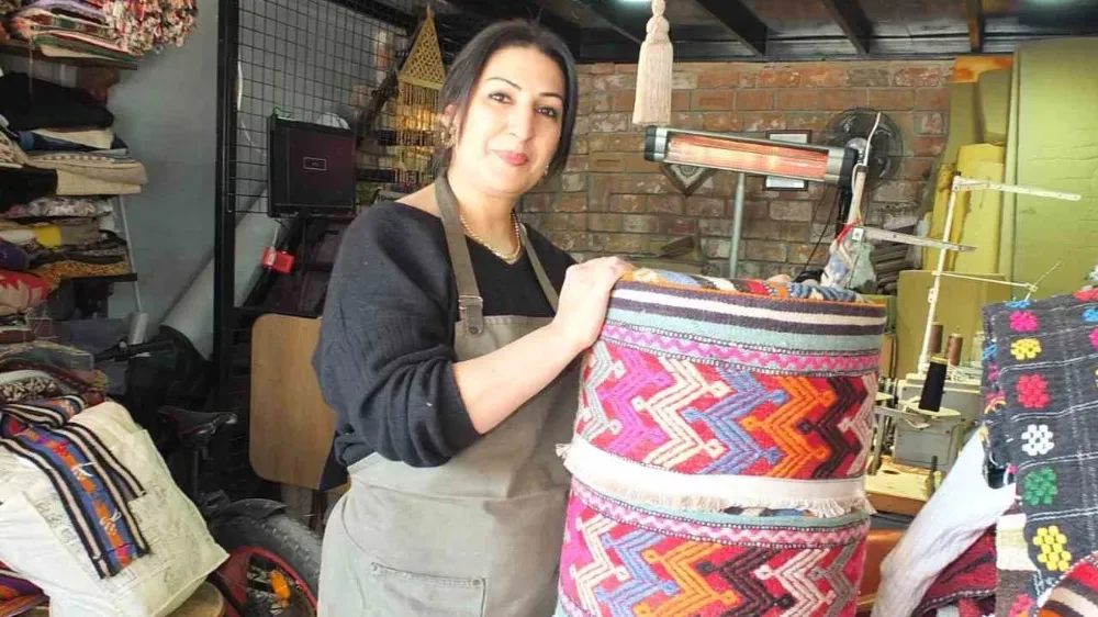 Eski halı ve kilimlerin sağlam olan bölümlerini ayıran Hasgül, bunlardan yastık ve kırlentler yaparken, şimdi de rengarenk puflar üretmeye başladı. İç piyasa da ilgi gören pufları yurt dışına da gönderdiklerini anlatan Handan Hasgül, işini severek yaptığını söyledi.