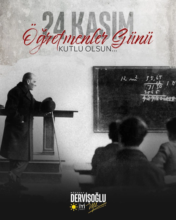 İYİ Parti Genel Başkanı Müsavat Dervişoğlu, 24 Kasım Öğretmenler Günü dolayısıyla öğretmenlere yönelik mesaj yayımladı. Dervişoğlu mesajında, “Evlatlarımızın yüreğindeki, fikrindeki güneş sizlersiniz. Geleceğimizi aydınlatan sizlersiniz” ifadelerini kullanarak öğretmenlerin toplumdaki önemine dikkat çekti.