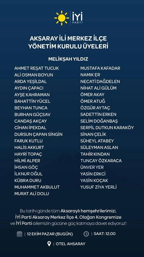 Kongreye, İYİ Parti Aksaray Milletvekili Turan Yaldır, İl Başkanı Sercan Belgemen, mevcut Merkez İlçe Başkanı Osman Yılmaz, İYİ Parti Belediye Başkan Adayı Tuğrul Karacaer, Yeşilova Belediye Başkanı Adnan Bayraktar, Gelecek Partisi İl Başkanı Gafur Yıldız, Anahtar Parti İl Başkanı Ali Karakuş, Anahtar Parti Merkez İlçe Başkanı Mustafa Doğukan Kızıl, İl Genel Meclis Üyesi Ömer Faruk Ağır, belediye meclis üyeleri, önceki dönem il ve ilçe başkanları ile çok sayıda partili ve delege katıldı.