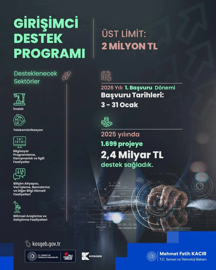 KOSGEB tarafından yürütülen Girişimci Destek Programı kapsamında 2026 yılı 1. dönem başvuruları başladı. “KOSGEB Girişimcilerini Seçiyor” mottosuyla hayata geçirilen program çerçevesinde, işini kurmak veya mevcut işini geliştirmek isteyen girişimcilere 2 milyon TL’ye kadar destek sağlanacak. Başvurular 3–31 Ocak 2026 tarihleri arasında alınacak.