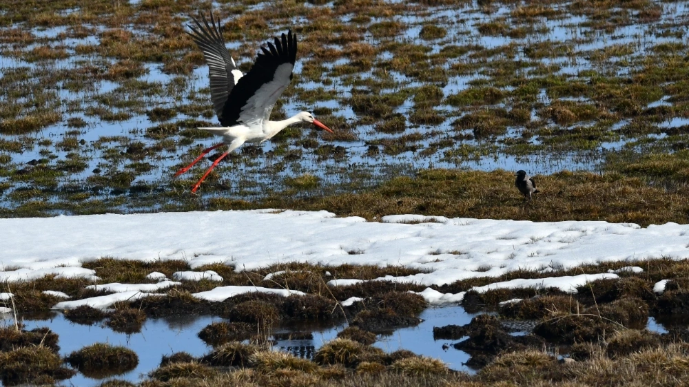Çayırlık alanda, karların erimesiyle oluşan sulak bölgelerde leyleklerin yanı sıra angut ve kız kuşu gibi göçmen kuşlar da yiyecek ararken objektife yansıdı.