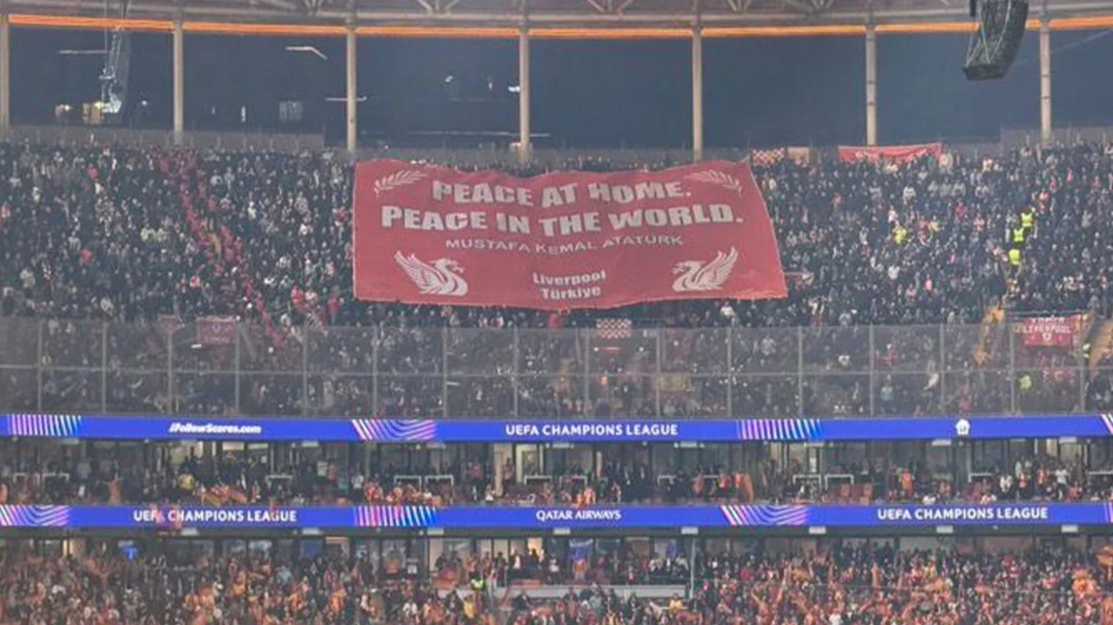 Stadyumda yerini alan Liverpool taraftarları, Ulu Önder Gazi Mustafa Kemal Atatürk’ün sözlerinin yer aldığı bir pankart açtı.