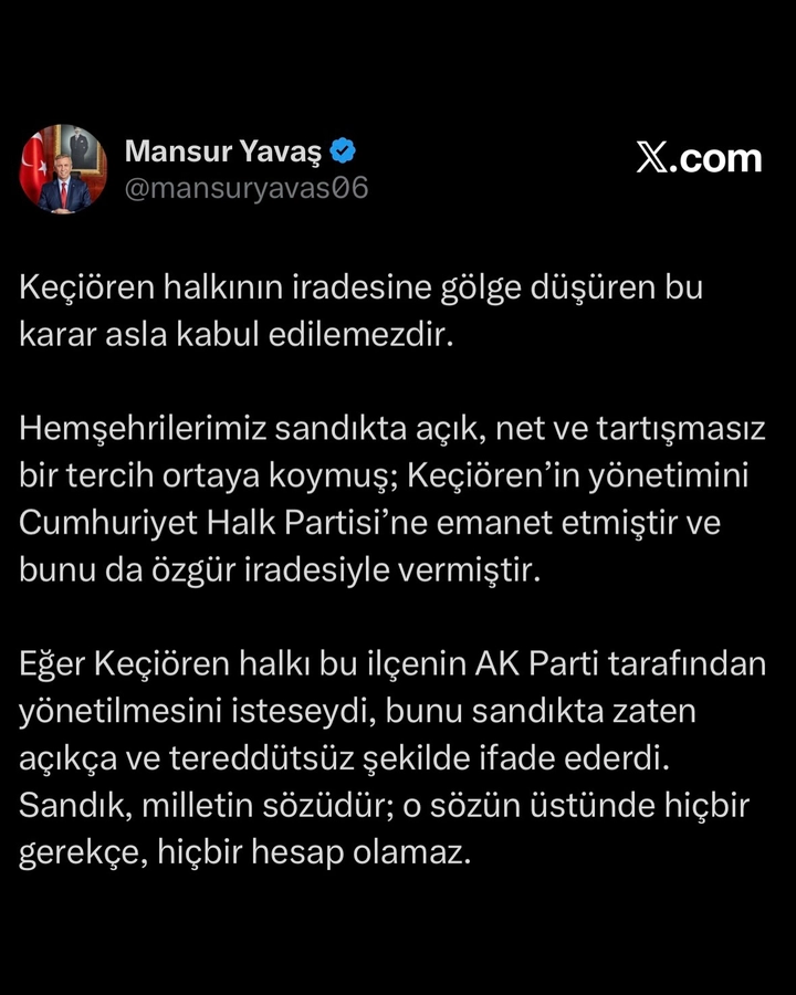 “Keçiören halkının iradesine gölge düşüren bu karar asla kabul edilemezdir. Hemşehrilerimiz sandıkta açık, net ve tartışmasız bir tercih ortaya koymuş; Keçiören’in yönetimini Cumhuriyet Halk Partisi’ne emanet etmiştir.”