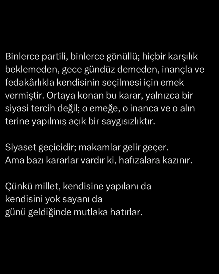 “Binlerce partili, binlerce gönüllü; hiçbir karşılık beklemeden, gece gündüz demeden, inançla ve fedakârlıkla kendisinin seçilmesi için emek vermiştir. Ortaya konan bu karar, o emeğe ve alın terine yapılmış açık bir saygısızlıktır.”