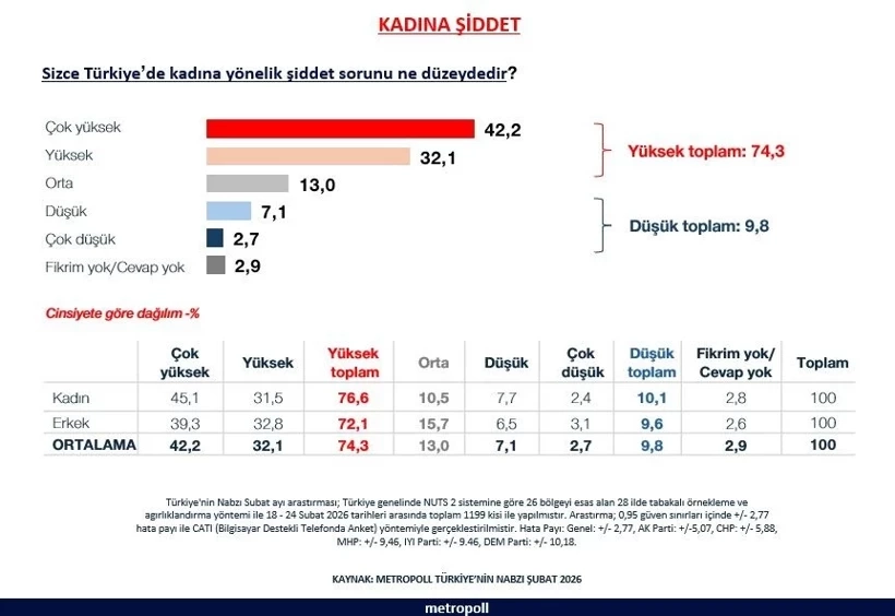 MetroPOLL Araştırma’nın 8 Mart Dünya Kadınlar Günü öncesinde yaptığı kamuoyu yoklaması, Türkiye’de kadına yönelik şiddet algısının oldukça yüksek olduğunu ortaya koydu. 28 ilde 1199 kişiyle yapılan ankette vatandaşların yüzde 74,3’ü kadına yönelik şiddetin “yüksek” ya da “çok yüksek” düzeyde olduğunu ifade etti.