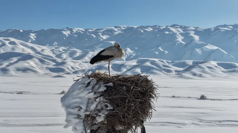 Görüntülerde ayrıca, kış mevsiminde elektrik direği üzerine yuva kurduğu görülen leylek de dikkat çekti. Karla kaplı ovada kısmen buz tutmuş yuvasında bekleyen leylek, kış manzarasıyla birlikte farklı bir görüntü sundu.