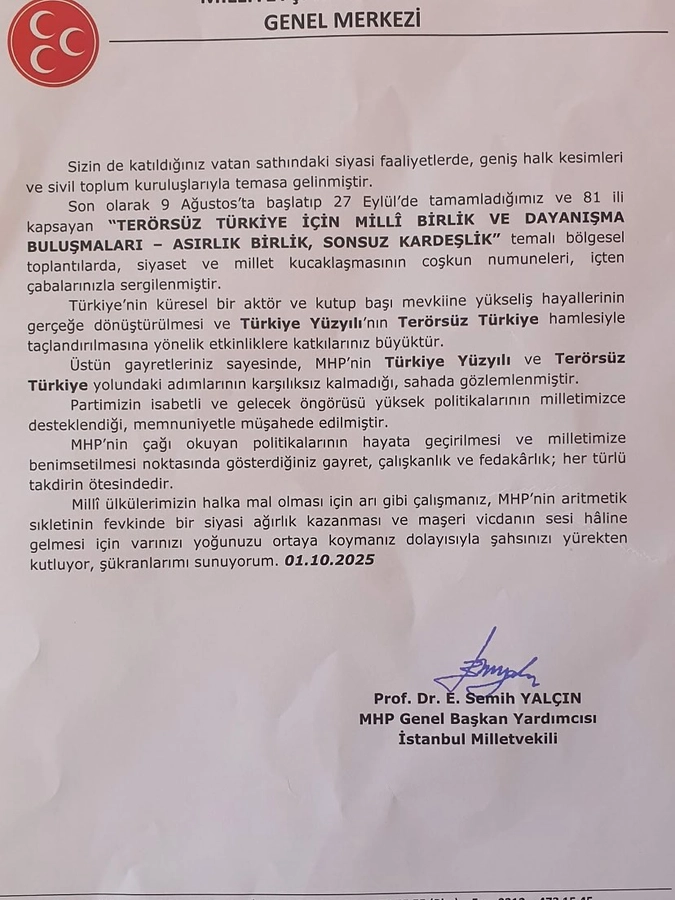 MHP Genel Başkan Yardımcısı Prof. Dr. E. Semih Yalçın tarafından kaleme alınan mektupta, Türkiye’nin yeni yüzyıldaki hedeflerine vurgu yapıldı.