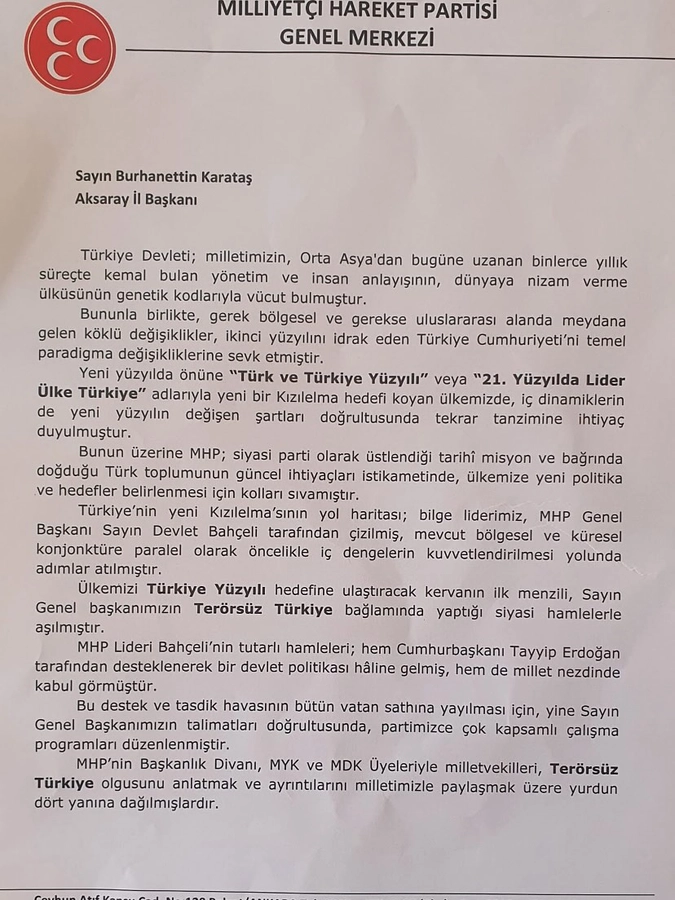 Genel Merkezden gönderilen yazıda, MHP’nin yeni yüzyıldaki hedefleri, Türkiye’nin millî birlik anlayışı ve “Terörsüz Türkiye” vizyonu kapsamlı şekilde ele alındı.