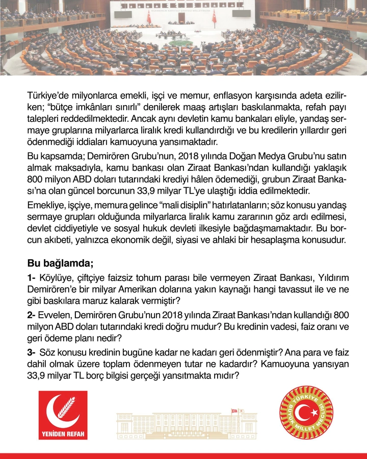 Türkiye’de milyonlarca emekli, işçi ve memurun yüksek enflasyon karşısında gelir kaybı yaşadığı bir dönemde kamu bankaları üzerinden kullandırılan büyük ölçekli krediler yeniden gündeme geldi. Konya Milletvekili Ali Yüksel, 25 Şubat 2026 tarihli yazılı soru önergesiyle, Demirören Grubu’nun 2018 yılında Ziraat Bankası’ndan kullandığı krediye ilişkin kamuoyuna yansıyan iddiaların açıklığa kavuşturulmasını talep etti.