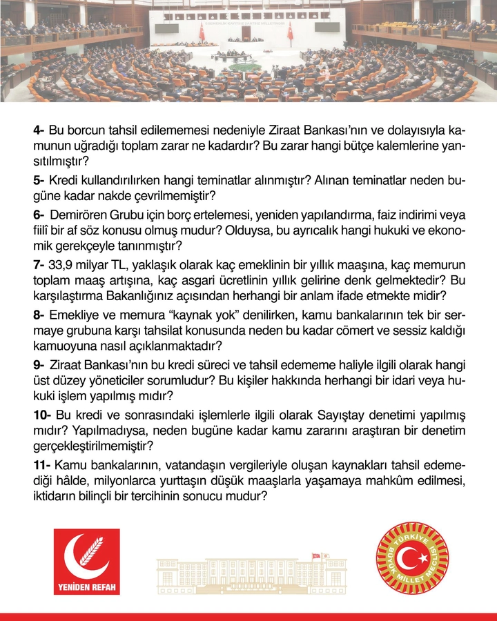 Önergede, kredi kullandırılırken hangi teminatların alındığı ve bu teminatların neden bugüne kadar nakde çevrilmediği de soruldu.
