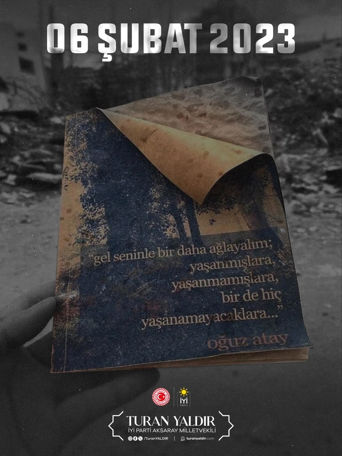 Türkiye tarihinin en büyük felaketlerinden biri olarak hafızalara kazınan 6 Şubat Kahramanmaraş merkezli depremlerin üzerinden üç yıl geçti. On binlerce insanın hayatını kaybettiği, milyonlarca vatandaşın doğrudan etkilendiği depremlerin yıl dönümünde siyasi isimlerden peş peşe mesajlar gelirken, İYİ Parti Aksaray Milletvekili Turan Yaldır’ın paylaşımı dikkat çekti.