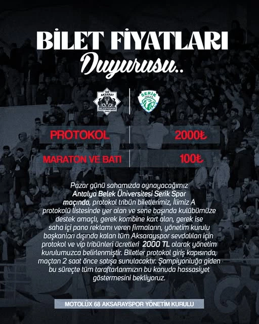 Motolux 68 Aksarayspor FK, şampiyonluk yolunda kritik virajlardan biri olan Antalya Belek Üniversitesi Serik Spor karşılaşması öncesinde taraftara güçlü bir çağrıda bulundu. Kulüp yönetimi, Pazar günü Aksaray'da oynanacak olan maç için hem bilet fiyatlarını duyurdu hem de taraftara tribünleri doldurma çağrısı yaptı.