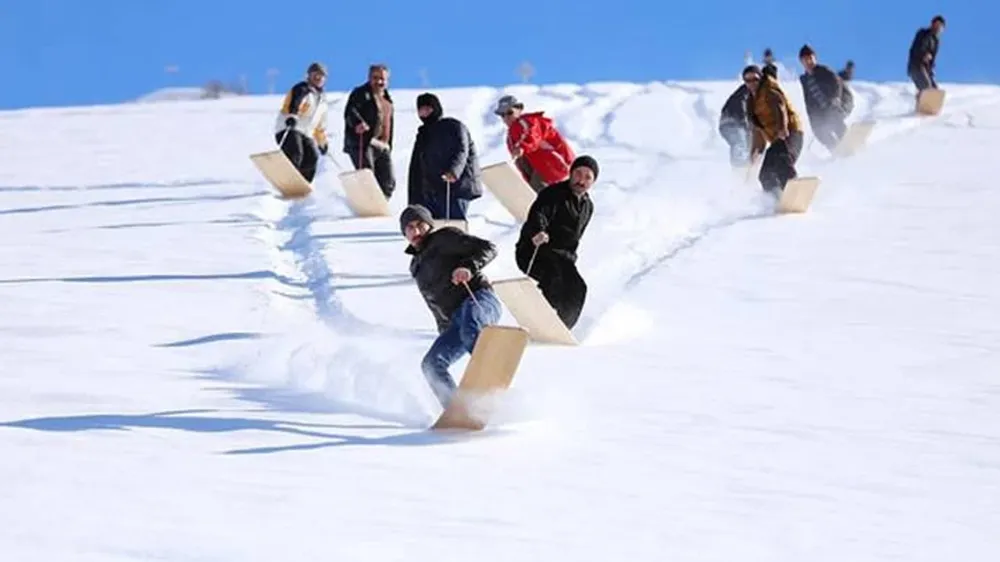 Etkinlikte naylon poşet ve çeşitli kayak ekipmanlarıyla kaymaya çalışan vatandaşlar da dikkat çekti.