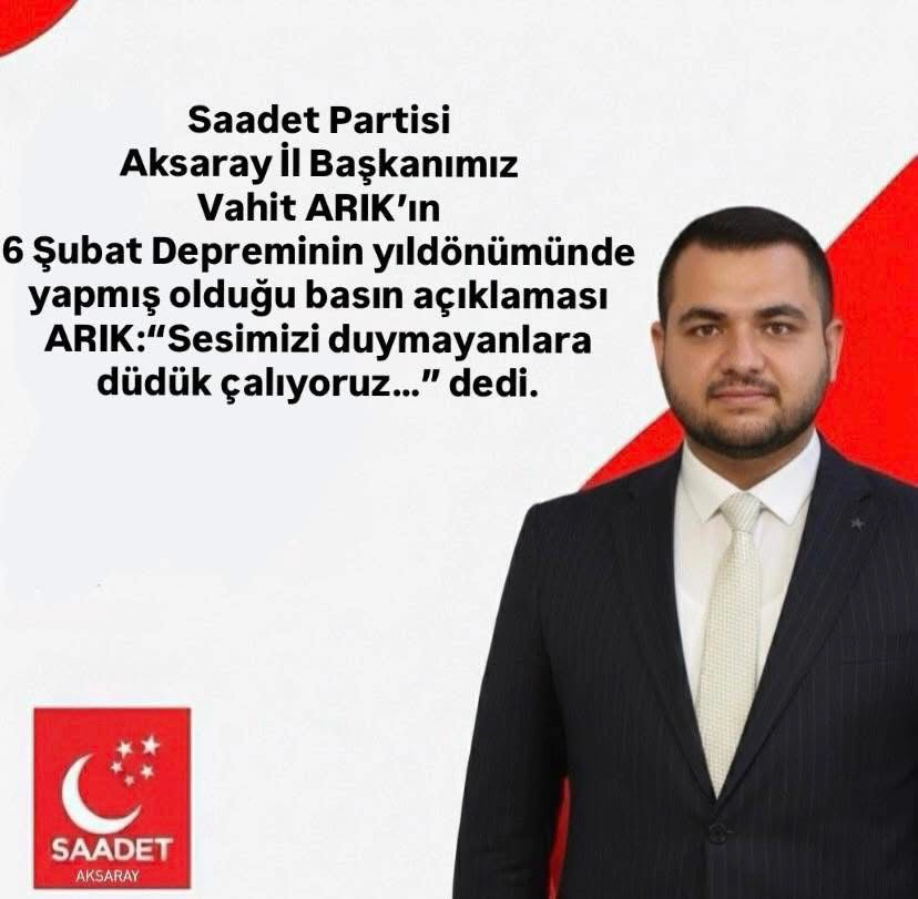 Saadet Partisi Aksaray İl Başkanı Vahit Arık, 6 Şubat 2023 Kahramanmaraş merkezli depremlerin yıl dönümünde yayımladığı basın açıklamasında çarpıcı ifadeler kullandı. Depremin değil ihmallerin öldürdüğünü vurgulayan Arık, “Rant, beton ve ihmalkârlık şehirlerimizi mezara çevirdi” diyerek yetkililere sert çağrıda bulundu.