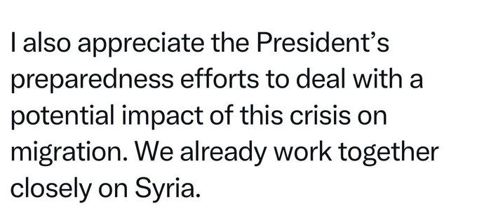 “Bu krizin (İran) göçle ilgili olası etkileriyle başa çıkabilmek için Cumhurbaşkanı’nın yaptığı hazırlık çalışmalarını da takdirle karşılıyorum. Suriye konusunda da zaten yakın iş birliği içinde çalışıyoruz.”