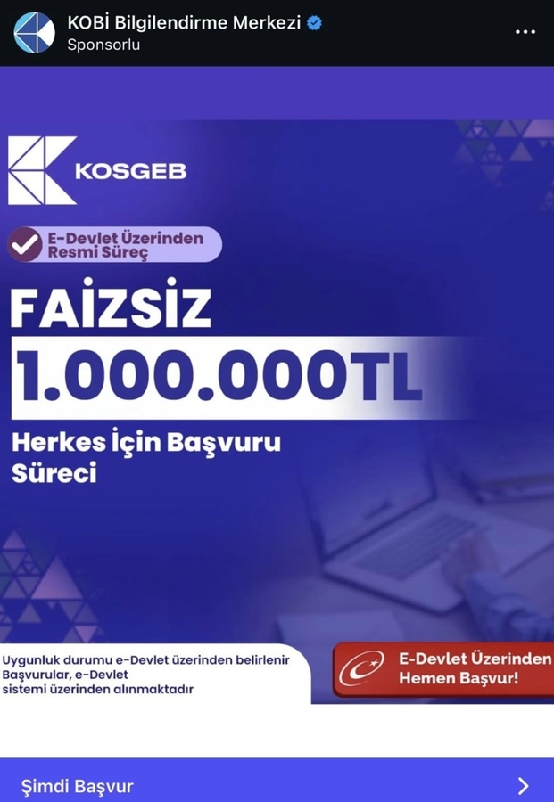 Son dönemde girişimcileri ve küçük işletmeleri hedef alan yeni bir dolandırıcılık yöntemi kamuoyunun gündemine oturdu. KOSGEB destekleri adı altında yayılan ve özellikle sosyal medya reklamlarıyla geniş kitlelere ulaştırılan içeriklerde, yüksek tutarlı faizsiz kredi ya da hibe verileceği iddia ediliyor. Ancak başvuru öncesinde belirli miktarlarda ücret talep edilmesi, uzmanlara göre organize bir sahtekârlığın en belirgin göstergesi.