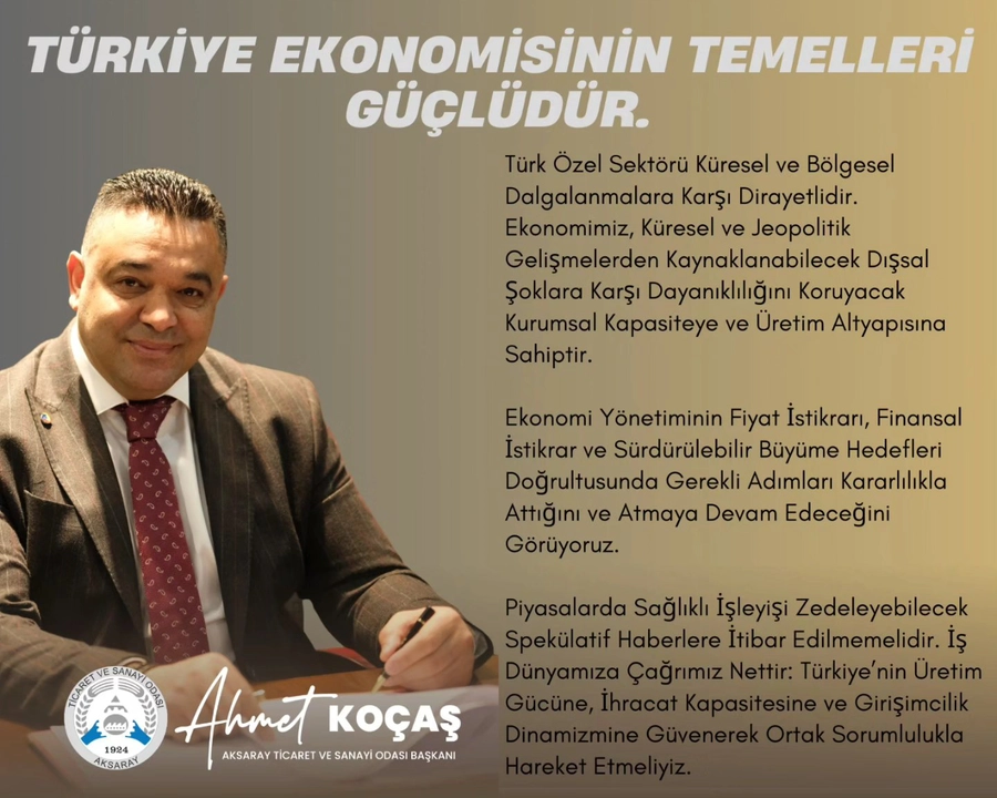 Aksaray Ticaret ve Sanayi Odası Başkanı Ahmet Koças, küresel ve jeopolitik gelişmelerin ekonomiye etkilerine ilişkin yaptığı açıklamada Türk özel sektörünün dışsal şoklara karşı dirençli olduğunu belirtti. Ekonomi yönetiminin fiyat ve finansal istikrar hedefleri doğrultusunda kararlı adımlar attığını ifade eden Koças, spekülatif haberlere itibar edilmemesi çağrısında bulundu.