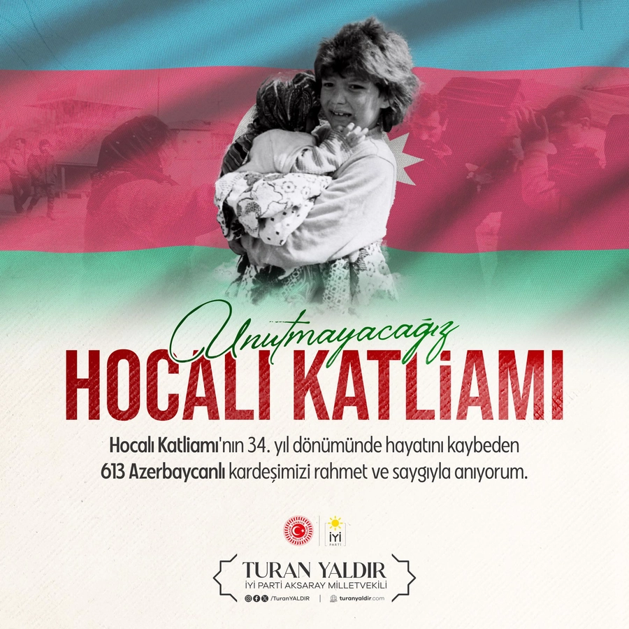 İYİ Parti Mali İşlerden Sorumlu Genel Başkan Yardımcısı ve Aksaray Milletvekili Turan Yaldır, Hocalı Katliamı’nın 34. yıl dönümünde yaptığı açıklamada 613 Azerbaycan Türkünü rahmetle andıklarını belirterek, “Hocalı yalnızca Azerbaycan’ın değil, insanlığın ortak vicdan sınavıdır” dedi. Yaldır, katliamın unutulmaması ve unutturulmaması gerektiğini vurguladı.