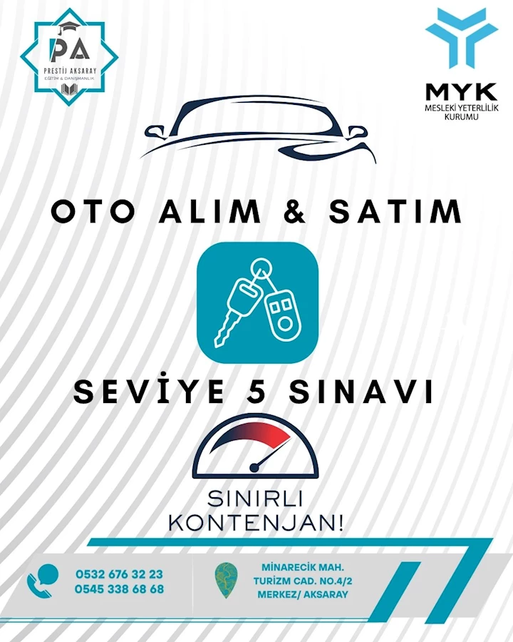Aksaray’da Mesleki Yeterlilik Kurumu (MYK) tarafından düzenlenen oto ekspertiz sınavları, sektör çalışanlarının mesleki yeterliliklerini belgelendirmelerine imkân tanıyor. Prestij Aksaray Eğitim ve Danışmanlık tarafından organize edilen sınavlarda başarılı olan adaylar, MYK Seviye 4 Oto Ekspertiz Belgesi almaya hak kazanıyor.
