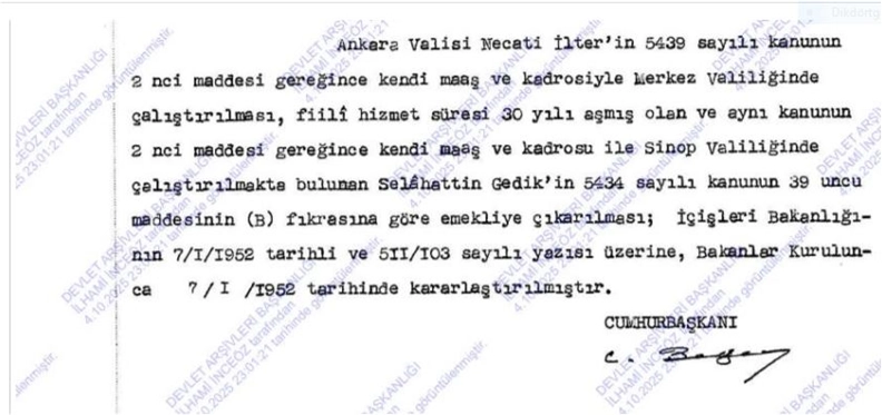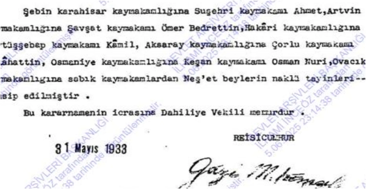 Dolayısıyla, Selâhattin Bey’i 1933 yılında Çorlu’dan Aksaray’a tayin eden kısmetli el, Reisicumhur Gazi Mustafa Kemal imzasıyla uğurlarken, 1936 yılında ise Selâhattin Bey’in Aksaray’dan, Çorum/Kargı’ya tayin emrini verdiğinde, artık Reisicumhur Kemal Atatürk imzasını kullanmaktadır.