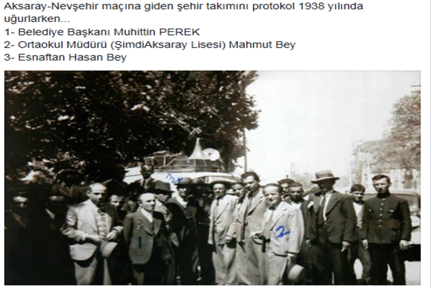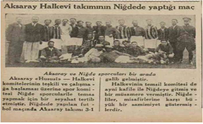 ‘’…Futbol alanı olarak eski buğday Pazarı hazırlanmıştır. Maç başlamış ve Aksaraylıların maç esnasında gösterdikleri ağır başlılık iki takıma tam bir Türk gençliği görüşüyle ve aynı centilmenlikle davranmaları, Niğde gençleri üzerinde unutulmaz saygı eserleri bıraktığı belirtilmiştir. Öğleden sonra boş kalan Niğde Halkevi gençleri Aksaray’ı gezmişlerdir. Cumartesi sabahı Niğde gençleri Aksaray’dan ayrılmışlardır. Aksaray’da bulunulan süre içerisinde Kaymakam Salahaddin Bey, Halk Partisi Başkanı Sadi Bey, Halkevi Başkanı Cevdet (sanırım Turan) Bey, katibi İzzet Bey (Turan), Eğitim memuru Osman Nuri Bey ve bütün diğer Aksaraylılara teşekkür edilmiştir (Resmi Niğde Gazetesi, 4 Mart 1935: 1).’’