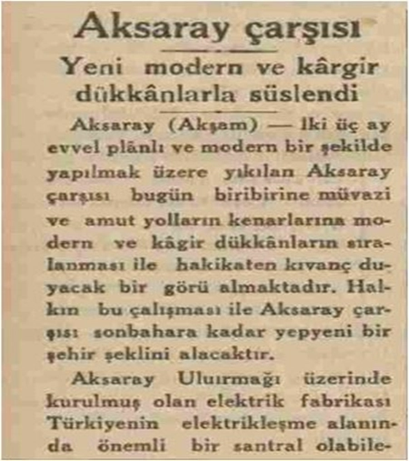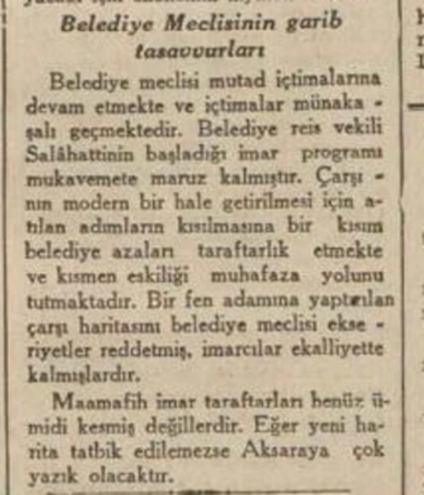 Vekil Selâhattin beye kimi meclis üyeleri muhalif olmalarına ve kimi durumlara şiddetle karşı çıkmalarına rağmen, Aksaray belediyesi yine de harap ve köhne halde bulunan büyük çarşıyı yıkarak, yerine güzel ve büyük bir çarşı yaptırır.
