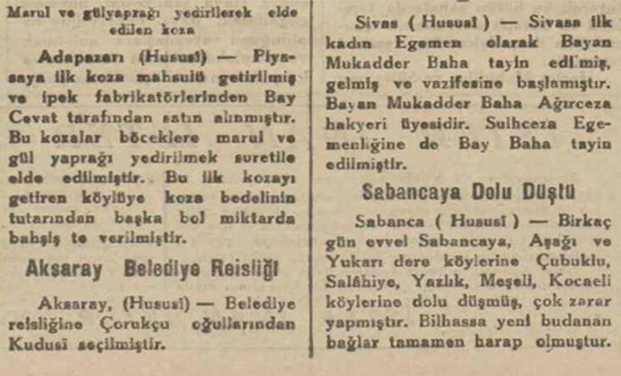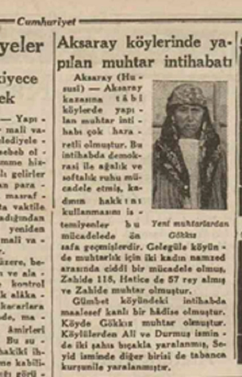 Aynı yıl Nisan ayında Gelegüle’de yapılan muhtarlık seçimlerinde ise Hatice ve Zahide hanımlar yarışmış, Zahide hanım 115 oy, Hatice hanım 57 oy almıştır. 115 oyla Zahide hanım muhtar seçilmiştir. Gümbet köyünde ise zafer Gökkız hanımın olmuştur. Aksaray ile köyler arası telefon bağlantıları kurulmuş, 300 km. uzunluğunda hat döşenmiştir. Acem ve Eskil köylerine artık belediye binası kurulmuş, bütçeleri oluşturulmuştur.