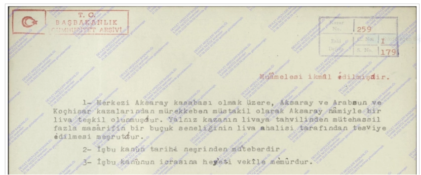 Mustafa Kemal emriyle Aksaray’ın vilayetliği yazısı.