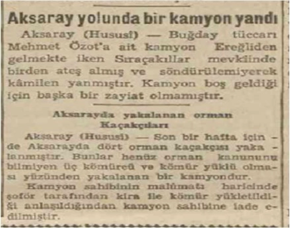 İlk kaymakamın tayininden yaklaşık bir yıl sonra, doğru dürüst yolu olmayan ama otomobil ve kamyonlara sahip Aksaray, 29 Temmuz 1937 tarihinde, kayda geçen belki de ilk trafik faciasını yaşar. Ereğli Aksaray arası buğday getirip götüren Mehmet Özot’a ait, buğday almaya gelen kamyon alev alarak yanmıştır. Ertesi gün gazeteye düşen haberin altında bir haber daha vardır. O da Aksaray’ın Orman kanununa muhalefet eden kömür kaçakçılarını ve kömür yüklü kamyonlarını, halka ifşa eder.