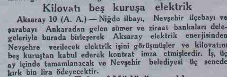Aksaray’da bir elektrik santrali, kullanılan elektrik, az da olsa telefon, kamyon ve otomobil de vardır. Aksaray’ın çağa pek uzak durmadığını da, bir ayrıntı olarak, iki sene evvel, ilk uçak ziyaretinin de 11 Kasım 1931 tarihinde Pamucak düzlüklerine konan Vecihi Hürkuş tarafından yapılmış olduğu, ayrıca Koçhisar uçağının da 1928 yılında alınıp kuruma bağışlandığı da hatırlanmalıdır. Yine, 1928 yılında kapanan ilk uçak fabrikası Tomtaş, Aksaray’ın komşusu Kayseri’de tekrar açılarak, bu yıllar arasında faal ve montaj yapar durumdadır.