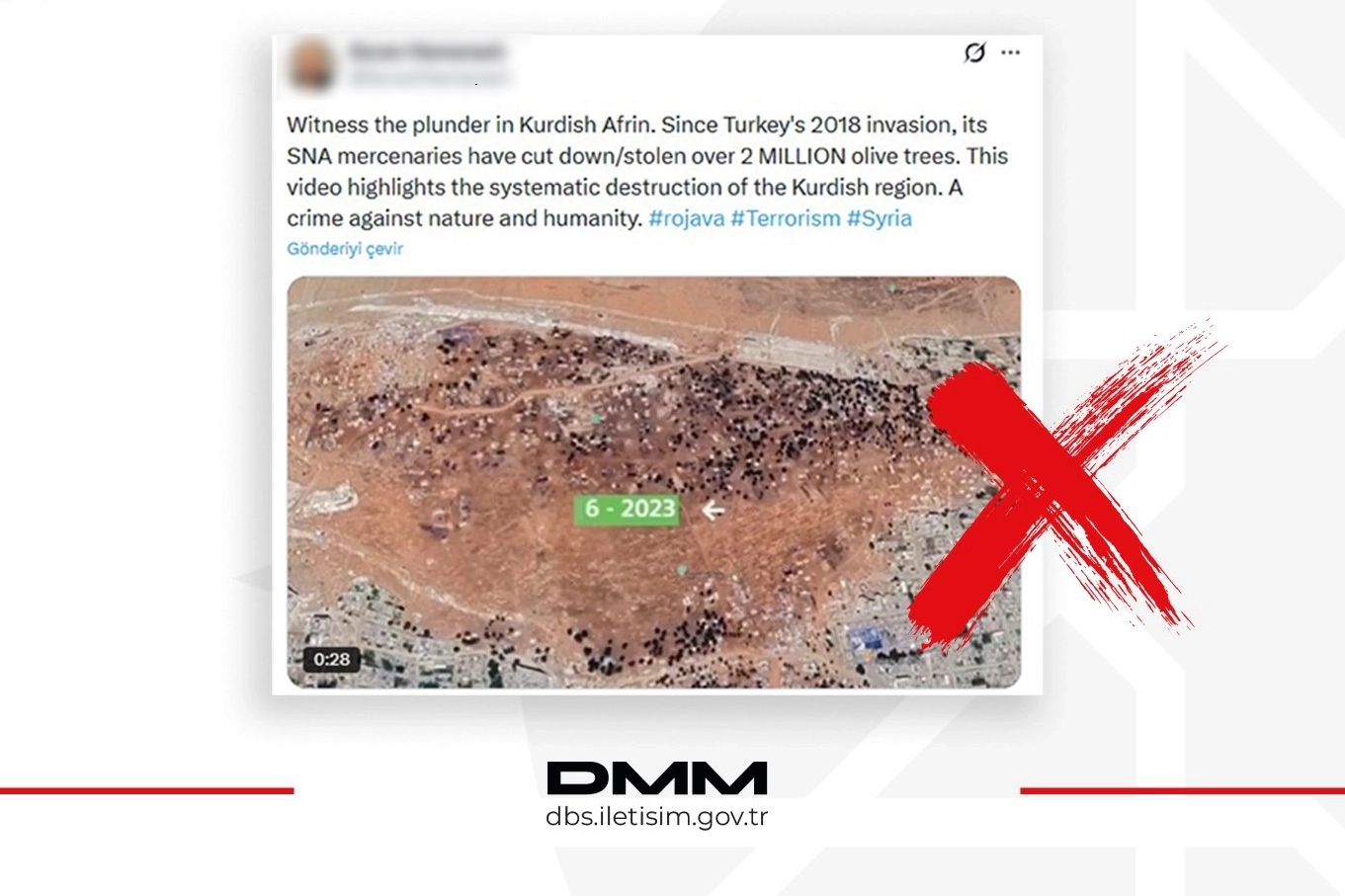 İletişim Başkanlığı Dezenformasyonla Mücadele Merkezi, Türkiye’nin Afrin’de 2 milyondan fazla zeytin ağacını kestiği yönündeki iddiaların tamamen asılsız ve kara propaganda ürünü olduğunu açıkladı.