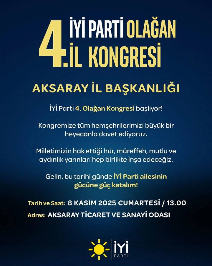 8 Kasım 2025 Cumartesi günü saat 13.00’te Aksaray Ticaret ve Sanayi Odası’nda gerçekleştirilecek kongre için tüm hemşehrilerine çağrı yapan İYİ Parti Aksaray İl Başkanı Sercan Belgemen, “Milletimizin hak ettiği hür, müreffeh, mutlu ve aydınlık yarınları hep birlikte inşa edeceğiz. Kongremize tüm hemşehrilerimizi büyük bir heyecanla davet ediyoruz. Gelin, bu tarihi günde İYİ Parti ailesinin gücüne güç katalım.” diyerek vatandaşlara seslendi.