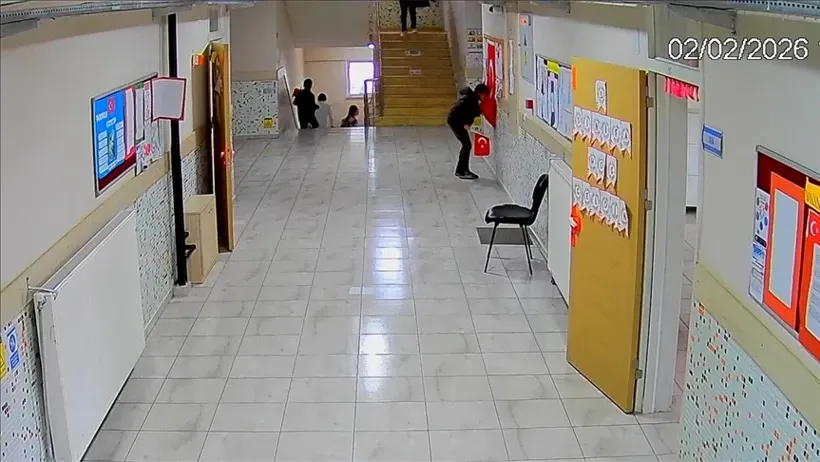 Uşak'ta teneffüse çıkan ilkokul öğrencilerinin, okul koridorundaki duvarda asılı Türk bayrağını öperek tenefuse çıkıyorlar.