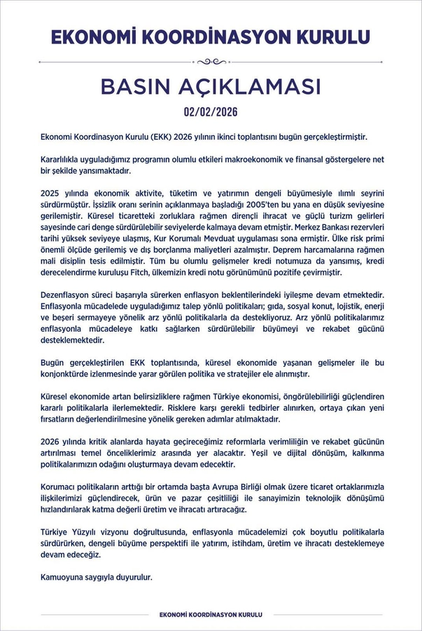 Öte yandan Ekonomi Koordinasyon Kurulu, 2 Şubat 2026 tarihinde gerçekleştirdiği toplantının ardından kapsamlı bir basın açıklaması yayımladı. Açıklamada, uygulanan ekonomi programının olumlu sonuçlar verdiği savunuldu.