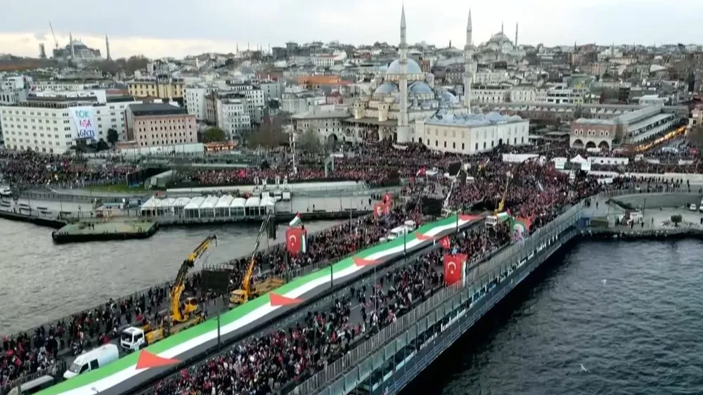 Cumhurbaşkanı Erdoğan'ın oğlu Bilal Erdoğan'ın çağrısı ile organize edilen "Sinmiyoruz, susmuyoruz, Filistin'i unutmuyoruz" mitingi İstanbul Galata Köprüsü'nde gerçekleşti. Konuşma yapan Bilal Erdoğan "Bizim meselemiz Nazizm gibi insanı değersizleştiren Siyonist ideolojiyle" dedi.